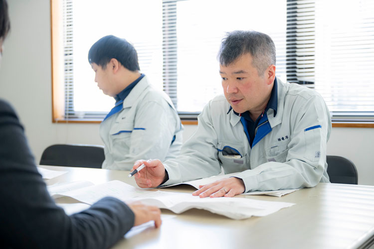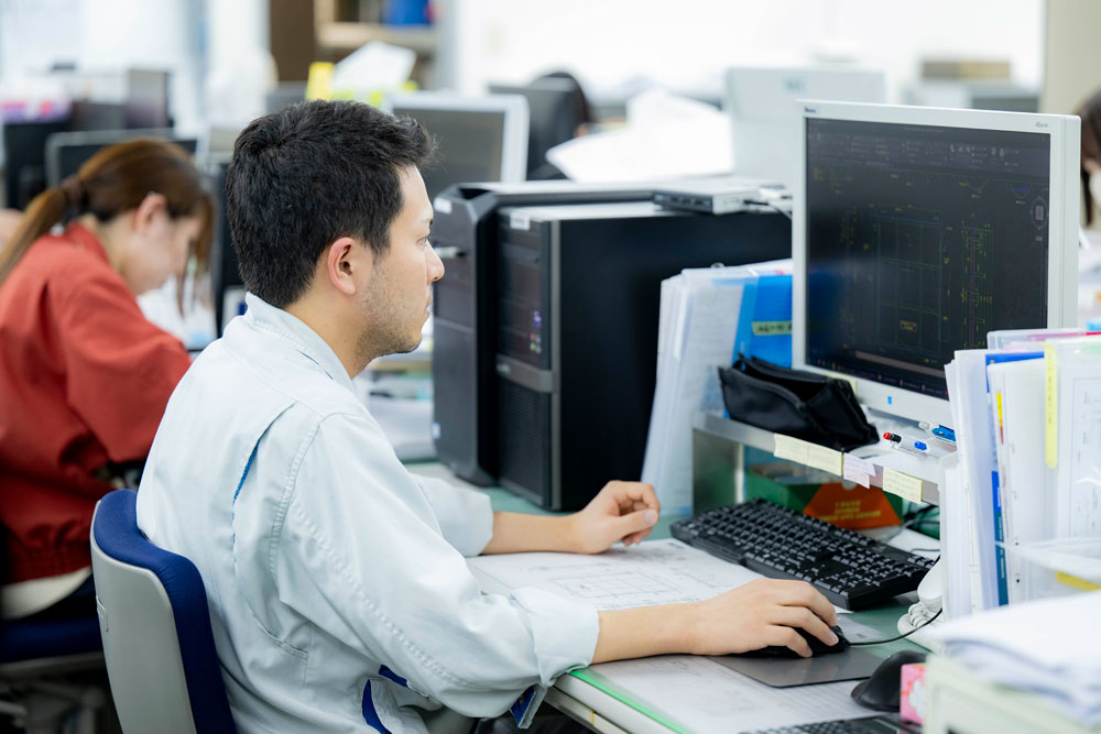 モノづくりは始めに設計ありきです。お客様のニーズを正確に捉え、設計された内容を具現化するために必要な製造方法を考え、コストダウンのための提案や納期実現のためのミーティングを行います。